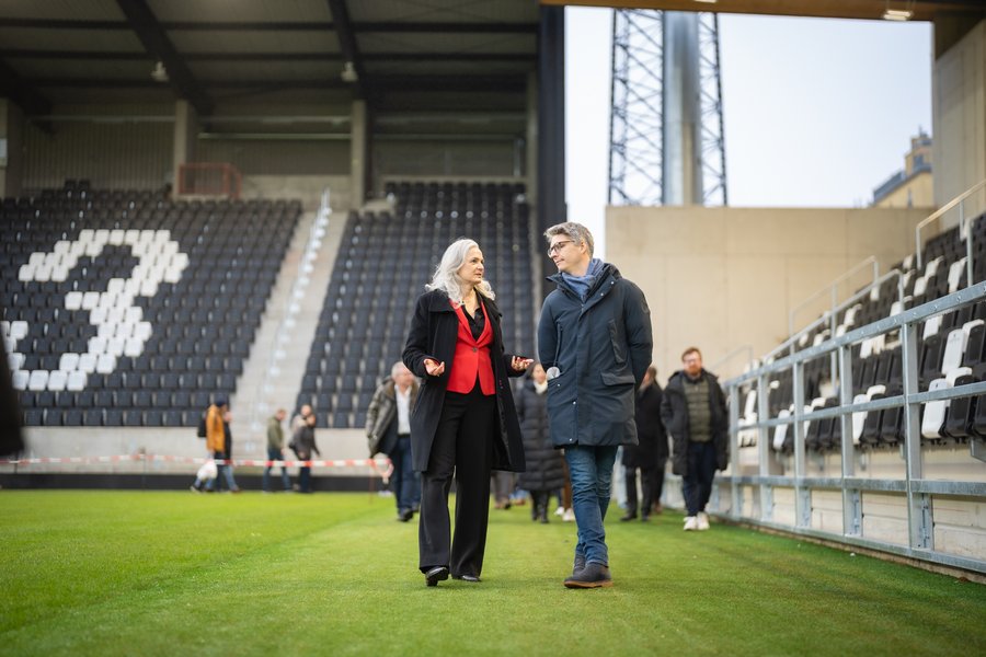 Bei der Begehung präsentierte sich das Stadion sichtbar im Aufbruch. Der neue Rasen wurde vollständig verlegt, die neuen Tribünenstrukturen sind weit fortgeschritten, und im Innenbereich laufen die Installationsarbeiten für Technik und Infrastruktur.